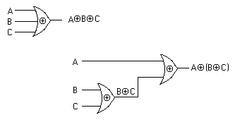For XOR and XNOR, it is not as obvious what the generalization to 3 or more inputs would produce. Cascading reveals that XOR is really an odd-parity test function. Odd parity means that the total number of 1s in a sequence of bits is odd. Thus the bit string 0110100000 conforms to odd parity since there are 3 ones. The bits 0110100001 conforms to even parity, because there are 4 ones, and 4 is an even number.