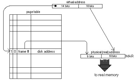 Fig. 12.6.2 illustrates this process using 24 bit virtual addresses and 1K pages (and frames) on a machine with only 1/2 Megabyte (524,288 bytes) of real memory. Dividing 524,288 by the page size (1024) gives us 512, which is the number of frames. Thus, the 16,384 pages of a program, its total virtual memory, must be somehow placed into 512 frames of real memory, and this of course is assuming that one program gets all of real memory, a very unrealistic assumption. Since there is only half a megabyte of real memory, the MAR would only be 19 bits long. |