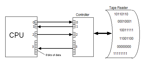 In this section we will see how a computer that has external ports connected to peripherals and IN and OUT instructions actually accomplishes I/O transfers. Fig. 18.2.1 shows a CPU is connected to a tape reader. Four ports are needed for proper communication: two for control, one for commands and a third for actual data. Ports 0 and 1 are the status ports, port 2 is the command port, and port 3 is the data port. Only the tape drive will put values on the data port, and only the CPU will put commands on the command port, but both the CPU and the tape drive will read and write the two status ports.