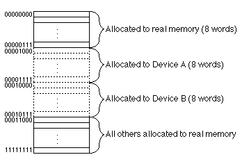 Fig. 18.7.1 shows the memory address space of a fictitious computer and where I/O peripherals have been assigned. There are 8 address bits, so there are only 256 addresses, from 00000000 up to 11111111. 8 of these addresses are allocated to device A while 8 others are allocated to device B. Memory gets all the rest. All the allocated words for a single device are contiguous, although main memory's addresses are not necessarily contiguous.