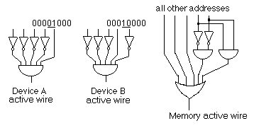 Fig. 18.7.3 shows the gates in the decoder of each device which set the activated wires. Each device also has a decoder that determines the specified address that is on the address bus, just as with main memory.