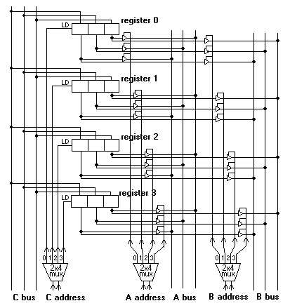 Tri-state buffers are used to electrically connect or disconnect the output wires from the registers to the wires of the A bus. The value on the decoder "decides" which register puts its value onto the bus, thereby assigning addresses to each register. In Fig. 8.7.2, one of the registers is 00, another is 01, another is 10 and the last is 11. |