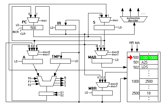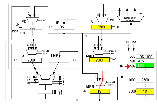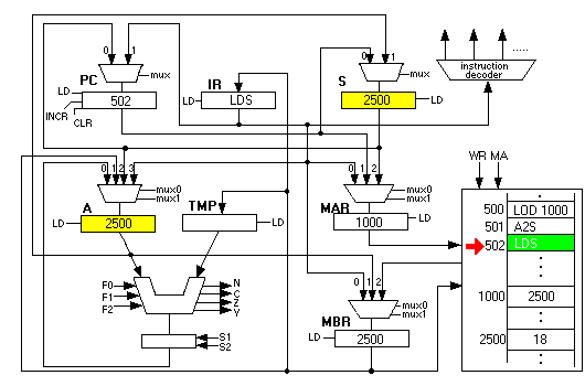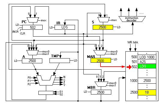 Now the fun begins. The next instruction is "LDS". This instruction first copies the contents of S into the MAR and initiates a memory read. Since 2500 is in the MAR, it is as if the CSC-1 computer had executed a "LOD 2500" instruction: