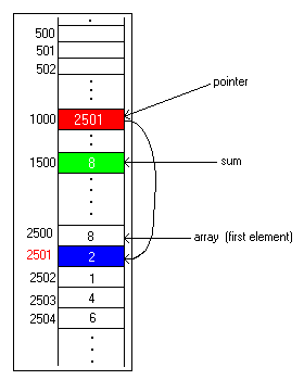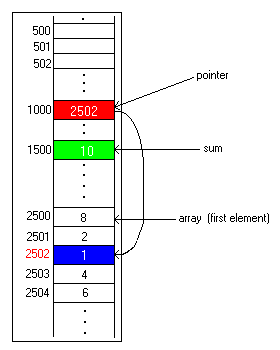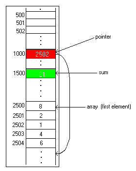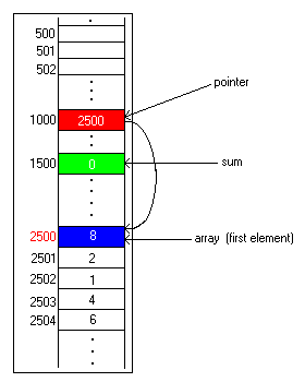 The picture below shows a 5-element array of small integers, in locations 2500 through 2504. A pointer variable is in location 1000, and it currently points to the first element of the array by having 2500 in it. A sum variable in location 1500 currently contains 0. When we are done, it will contain 8+2+1+4+6, or 21, which is the sum of elements of this array.