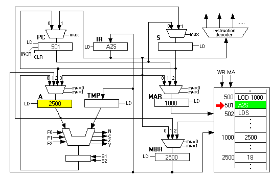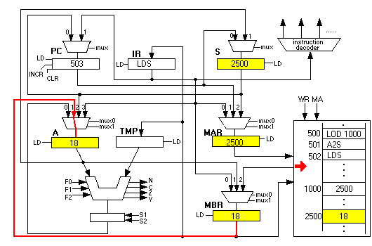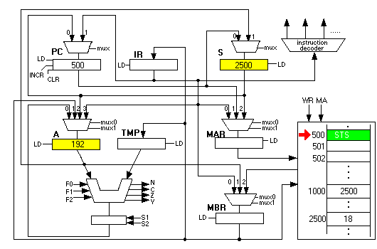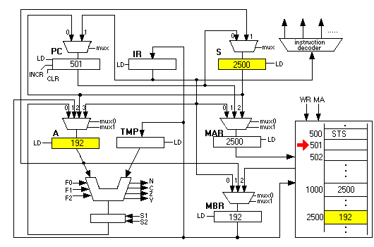STS copies the S register into the MAR and also copies the value of the A register into the MBR, then initiating a memory write. When it is done, we see 192 in location 2500:
